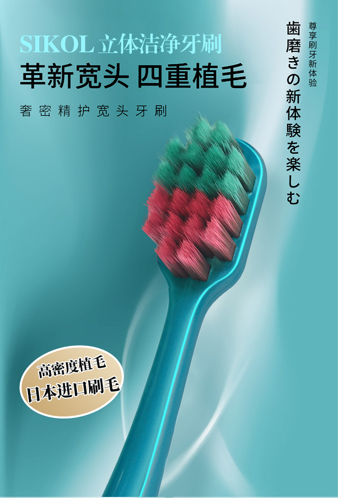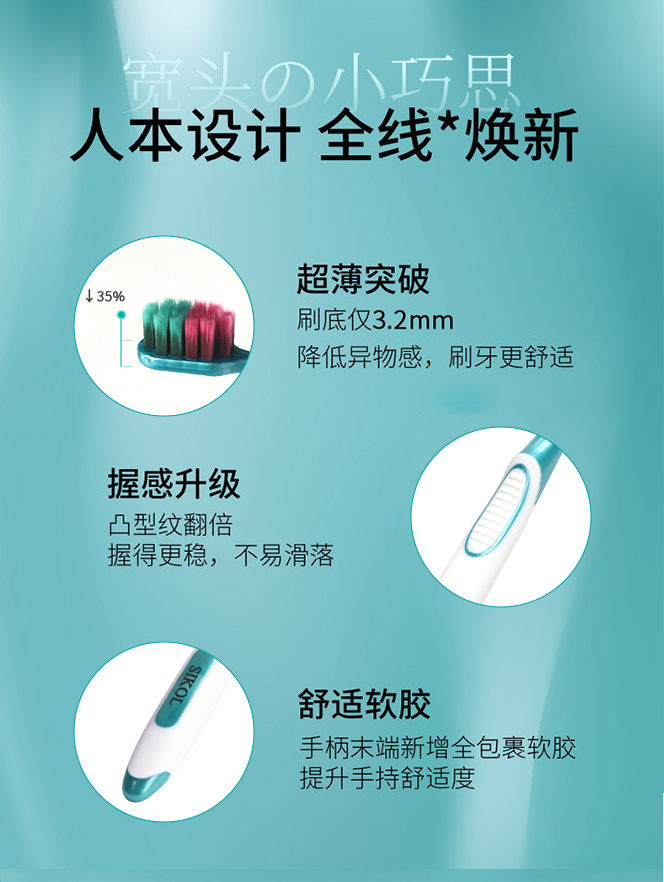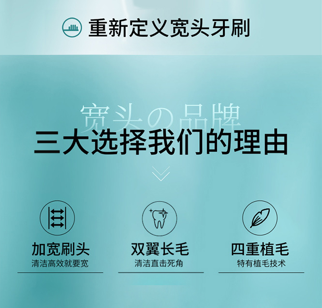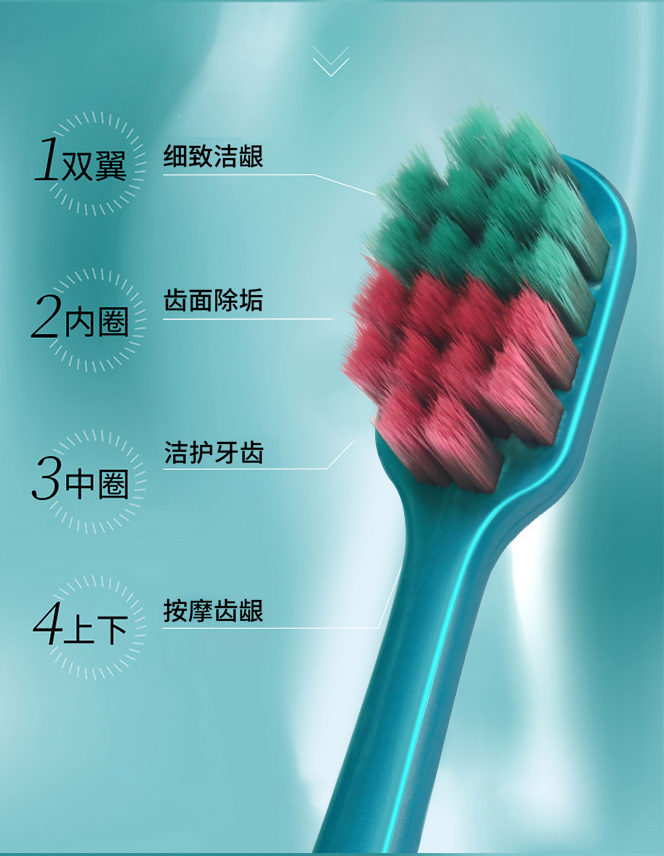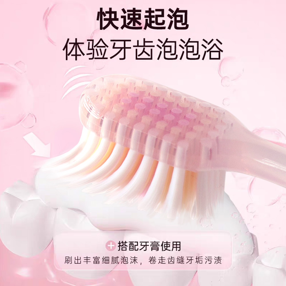 进口刷毛,毛量增加,高效清洁,厚度精简,深入智齿,山型植毛,减压更抗敏,给你从未体验过的口腔洁净体验!
