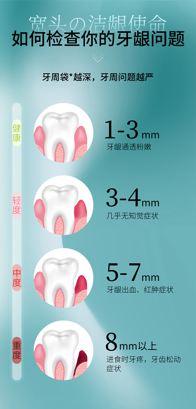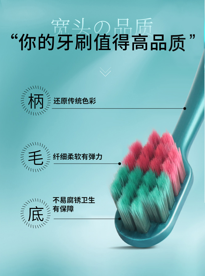 特长:进口刷毛,毛量增加,高效清洁,厚度精简,深入智齿,山型植毛,减压更抗敏,给你从未体验过的口腔洁净体验!